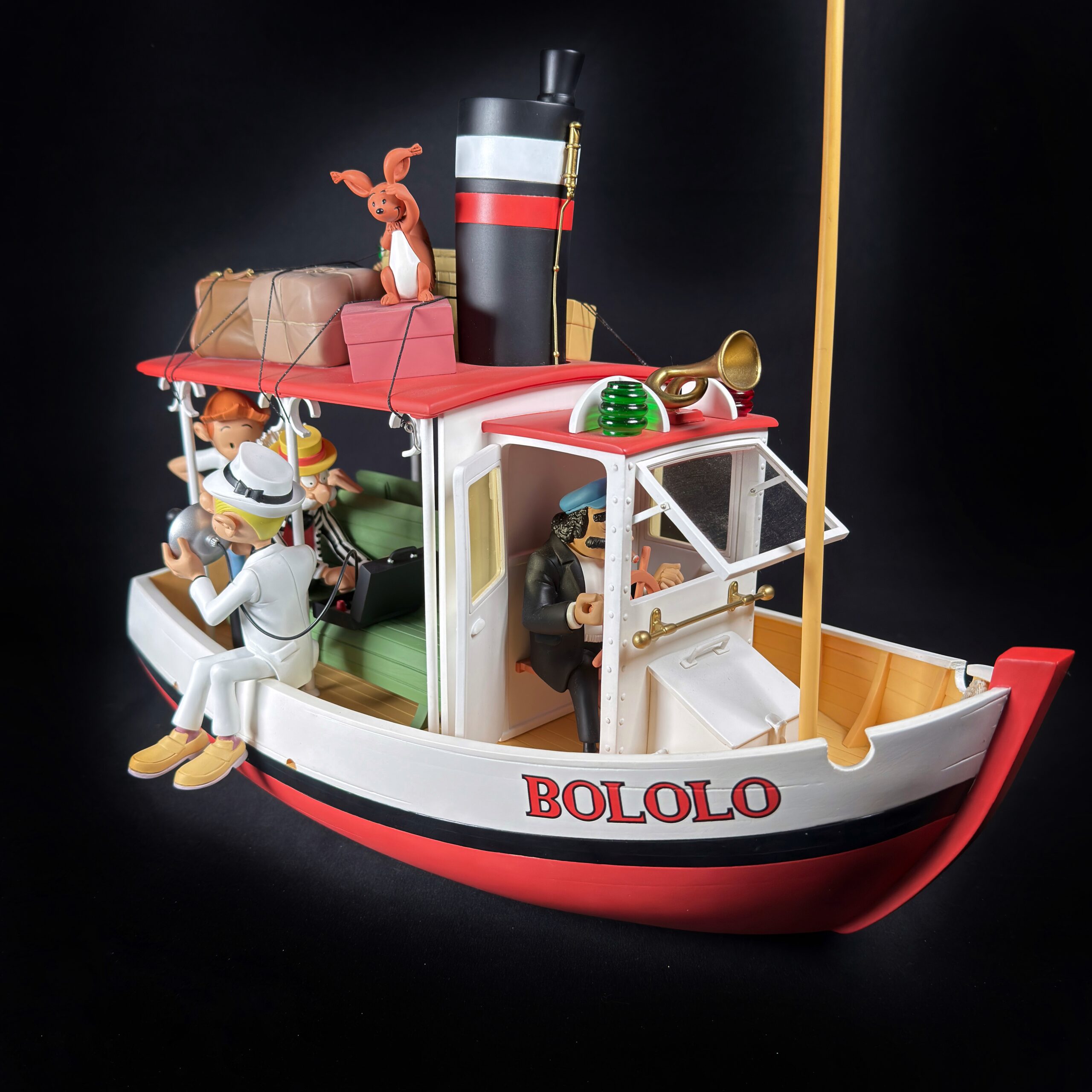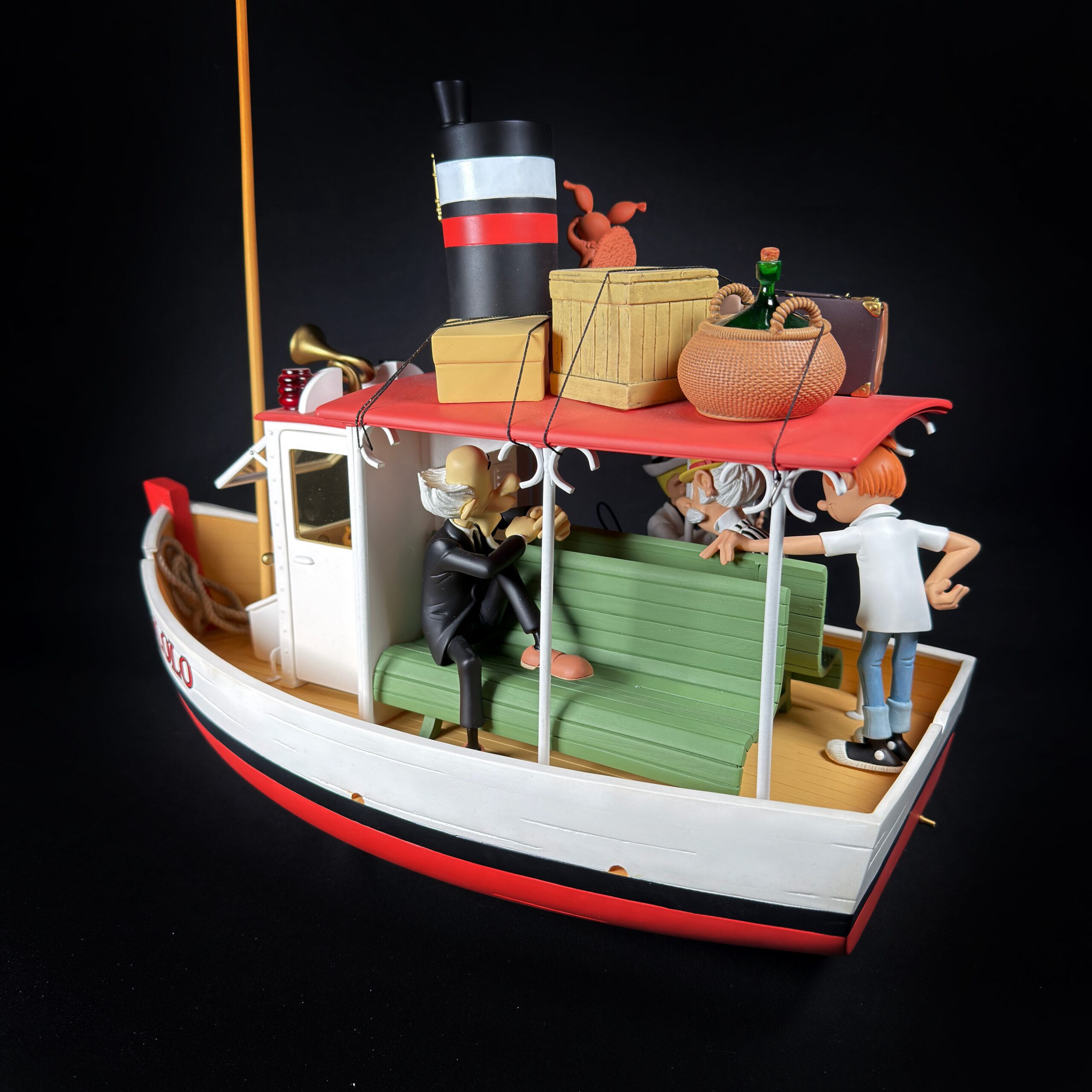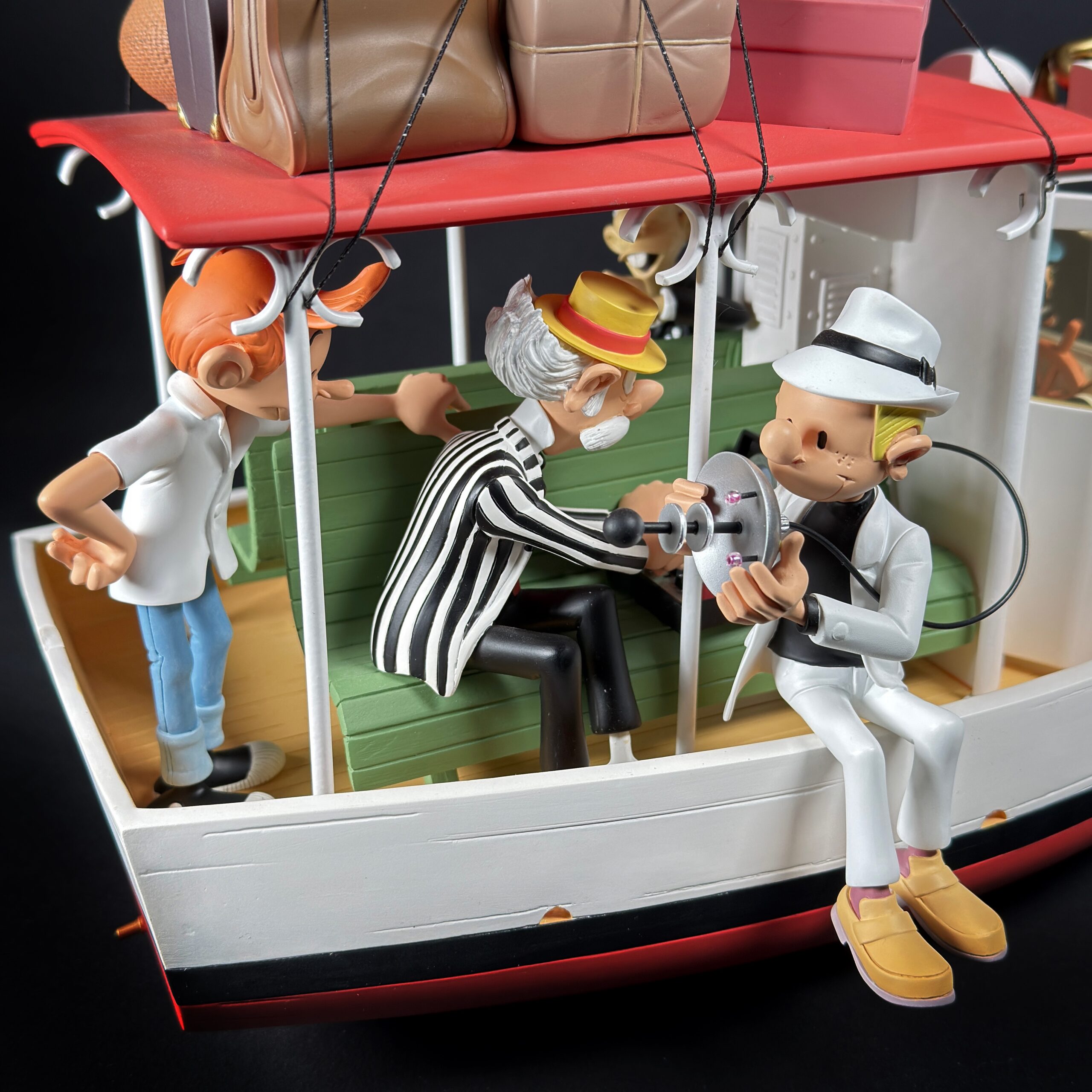 Inspiré d’une case de l’album de Jean Claude Fournier, TORA TORAPA, ce modèle met en scène sur le pont: Spirou, Fantasio, Champignac et Kata.  A la barre, le capitaine. Spip fait la vigie sur le toit.
