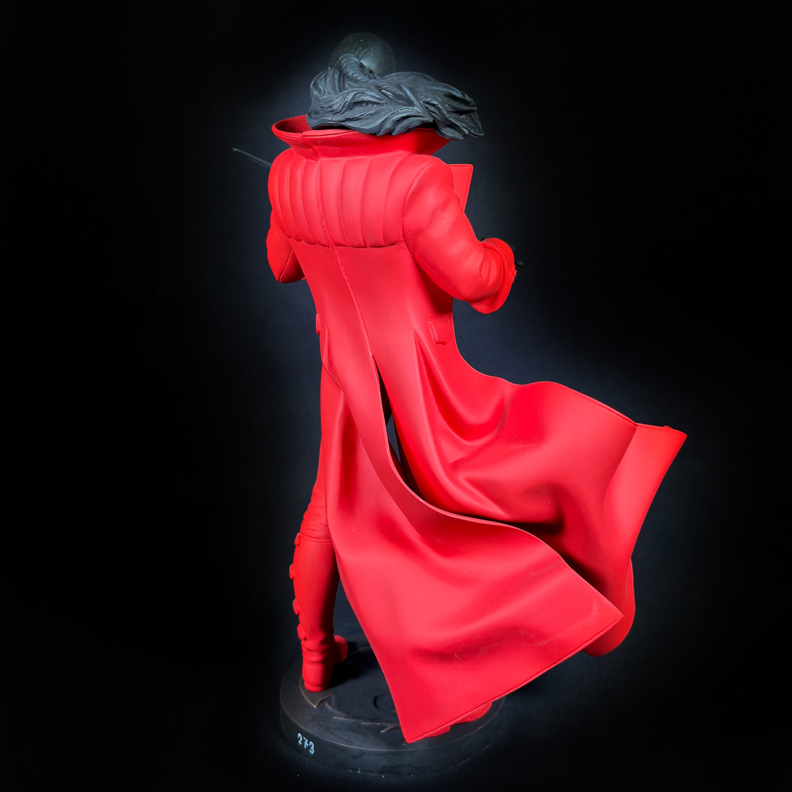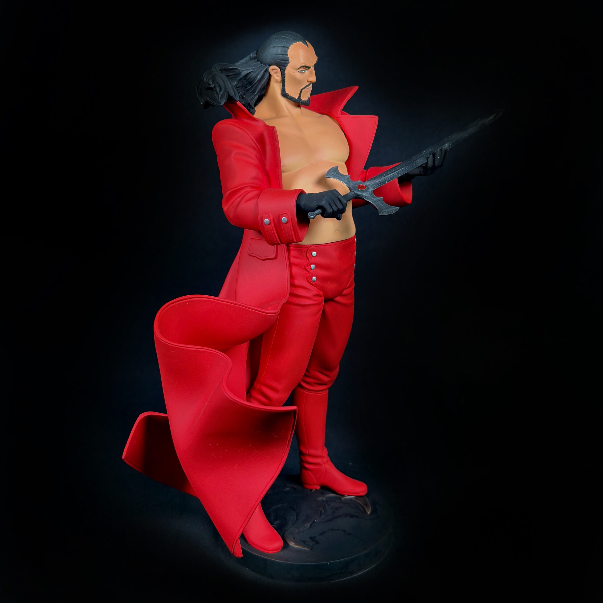 Le fait de lui faire tenir cette arme bien plus imposante a tout de suite généré une attitude plus campée, plus virile, plus menaçante aussi ; ce fut aussi l’occasion de réaliser un accessoire en métal, que l’on peut prendre en main et même utiliser contre qui l’on veut.