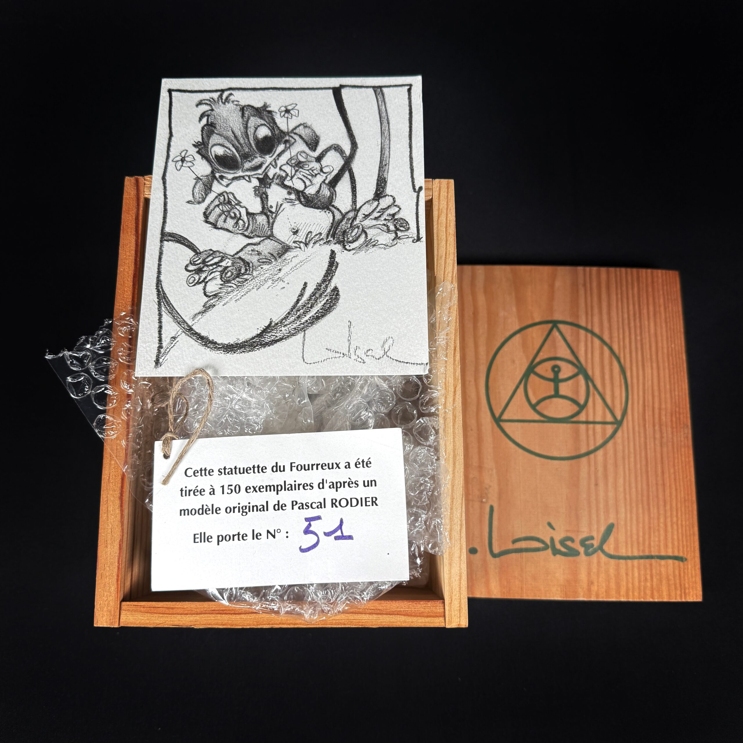 Version limitée extrêmement rare à 150 exemplaires, présentée dans un coffret en bois accompagné d’un dessin de l’auteur. Première création de Pascal Rodier aux débuts de Fariboles Productions, 30 ans après elle reste la mascotte de l’atelier.