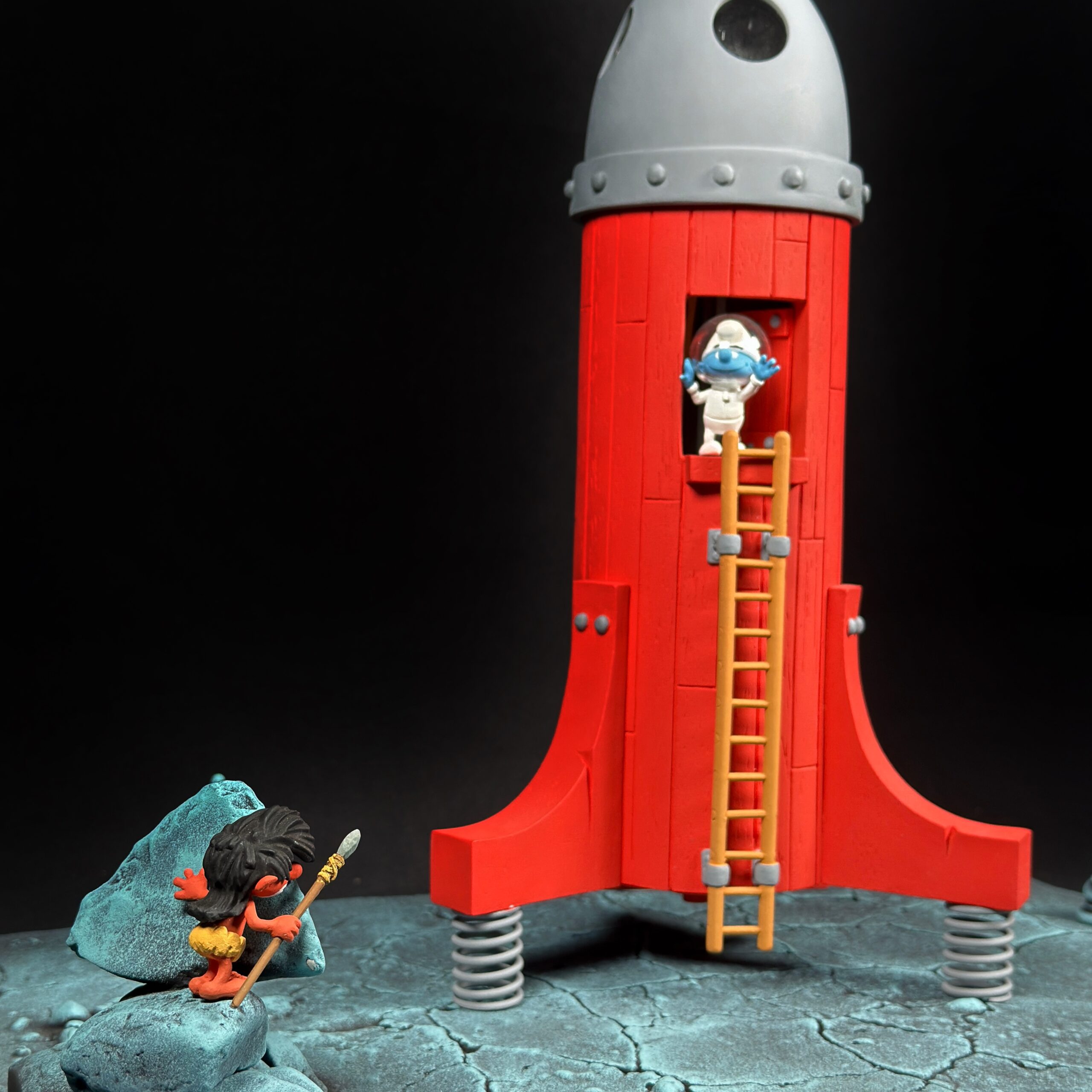 Finalement, après de longues séances de mise au point, de nombreuses heures d’insomnie pour que tous les petits problèmes de conception trouvent leur solution, nous sommes fiers de vous proposer LA fusée, telle que Peyo l’avait dessinée, avec en prime le respect intégral du cahier des charges : comme celle de l’album, elle est totalement incapable de s’envoler ! »
