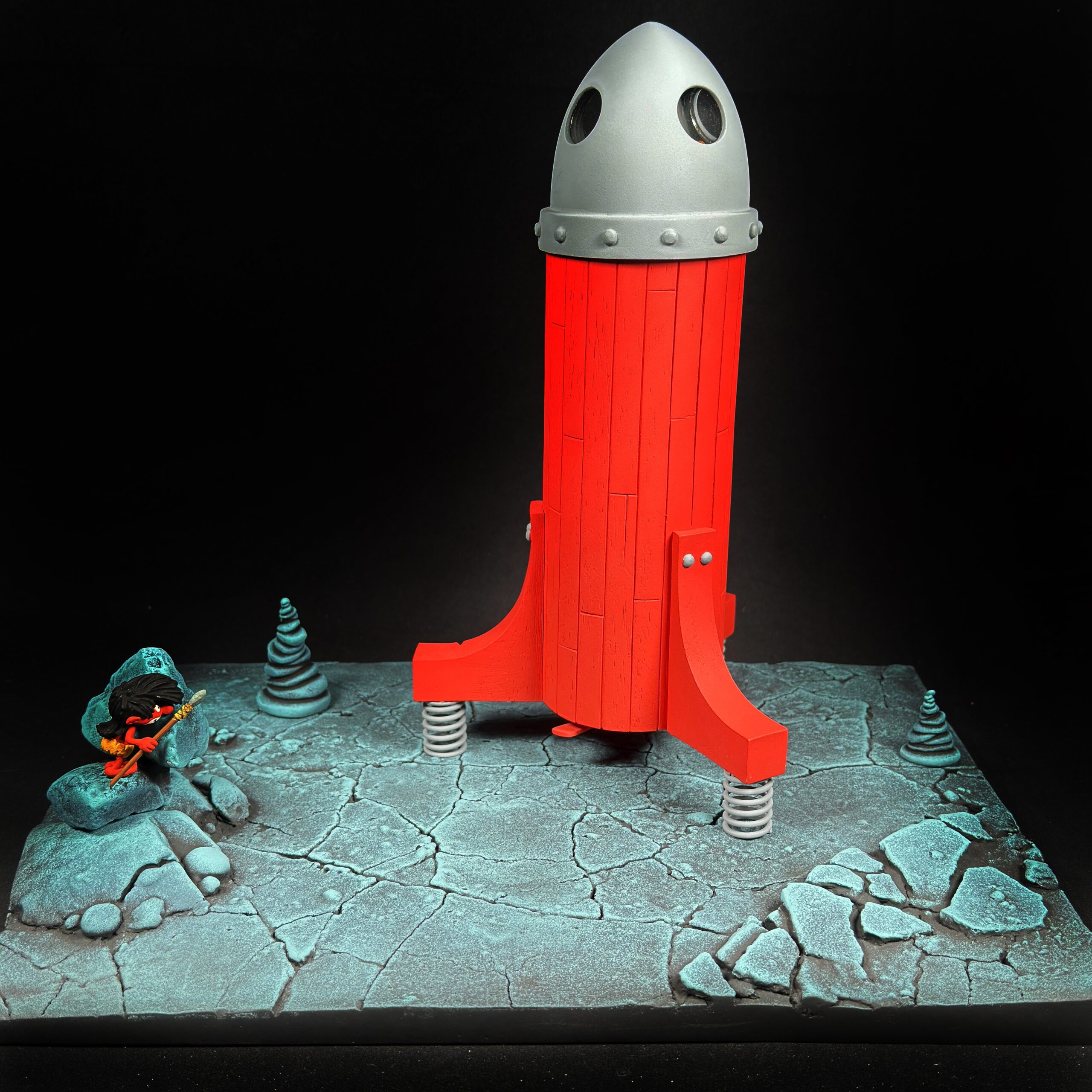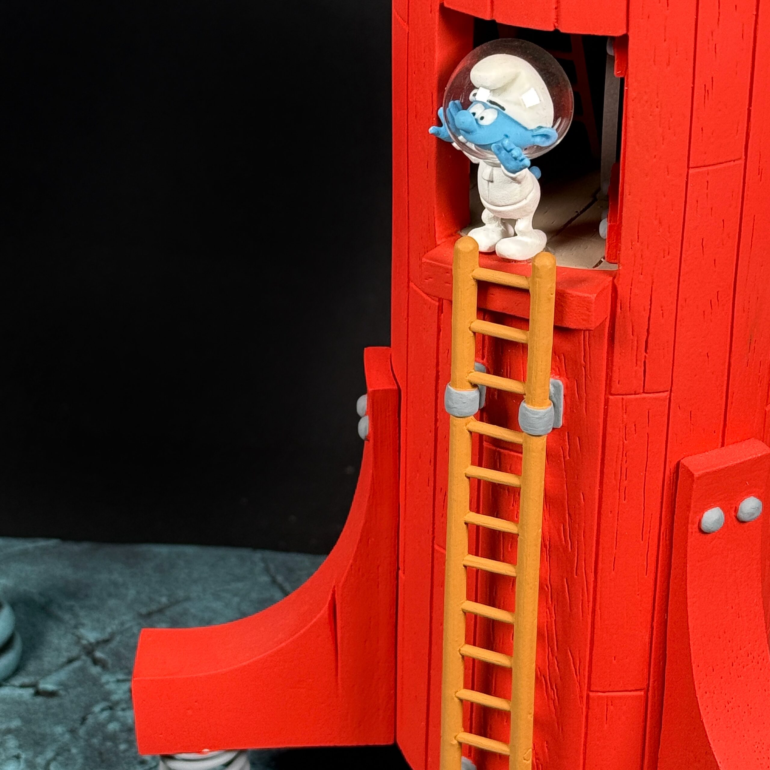 Nous avions Alban et moi-même la lourde responsabilité d’être au plus près du modèle afin de restituer toute la magie de ce petit vaisseau spatial et de son intrépide constructeur et pilote. Ce fut un véritable plaisir de voir apparaître peu à peu tous les éléments de cette petite fusée, de trouver les astuces pour en restituer le plus fidèlement possible chaque détail, d’imaginer le processus de fabrication pour que le scaphandre soit le plus beau possible ET que la tête du Cosmoschtroumpf puisse y entrer !