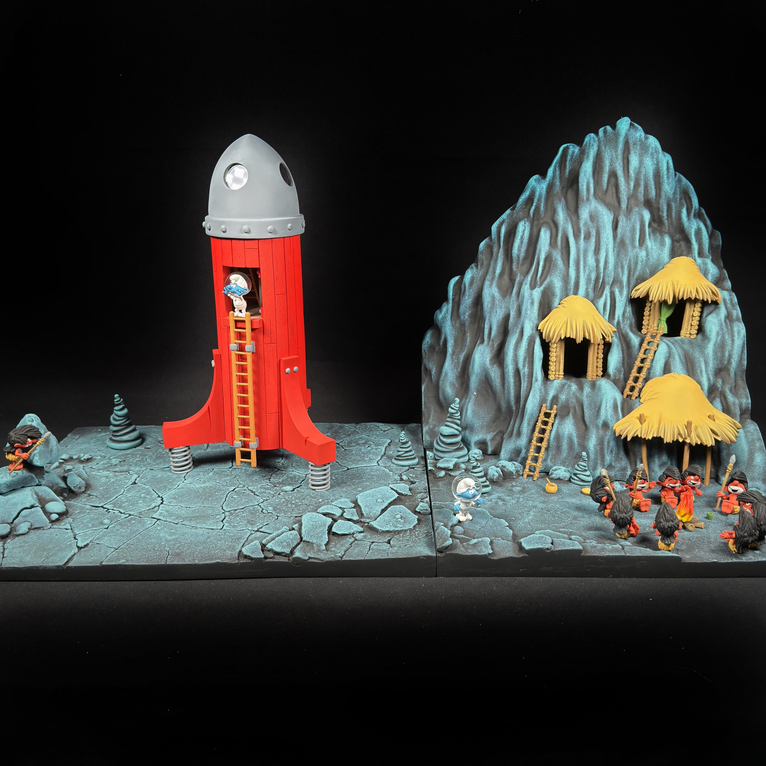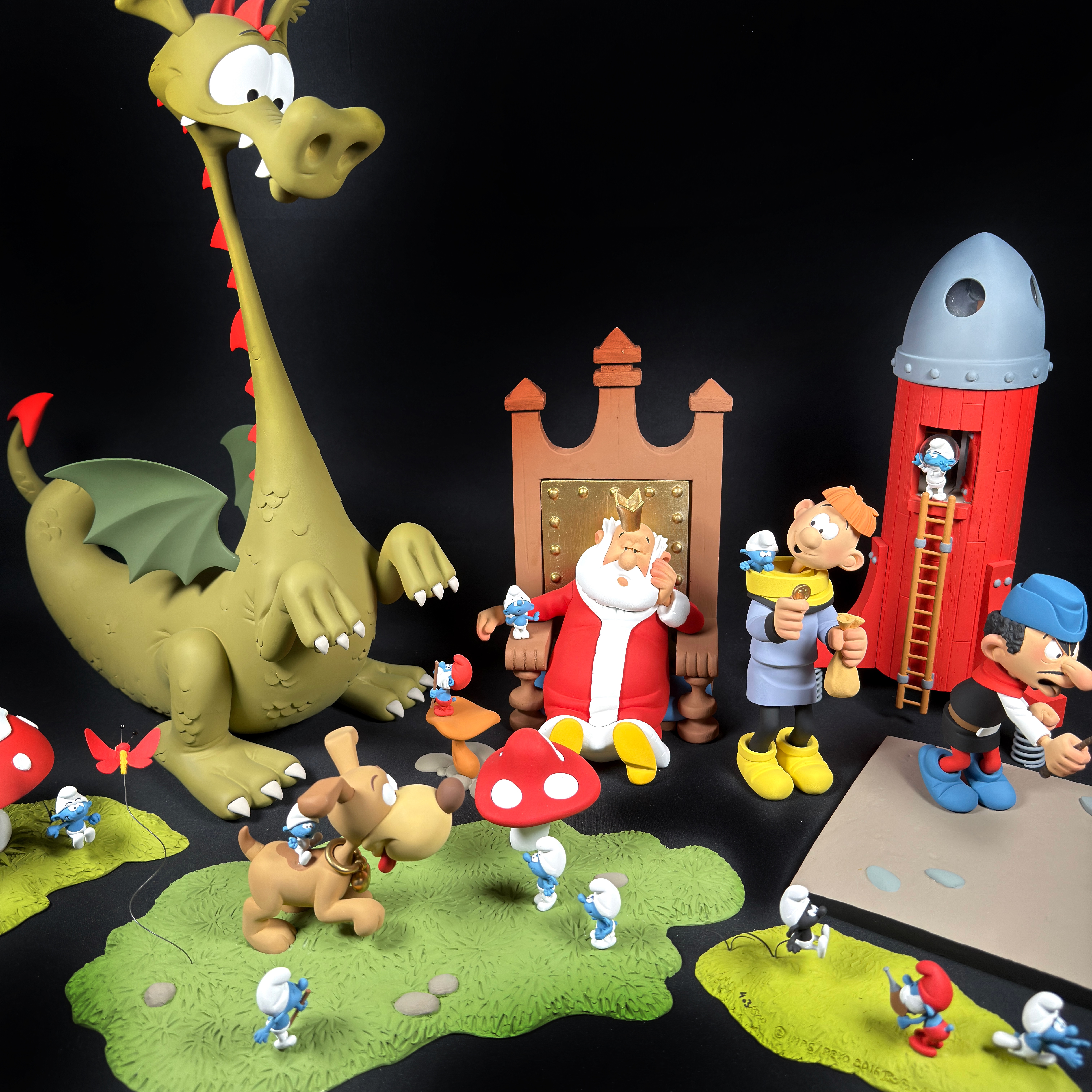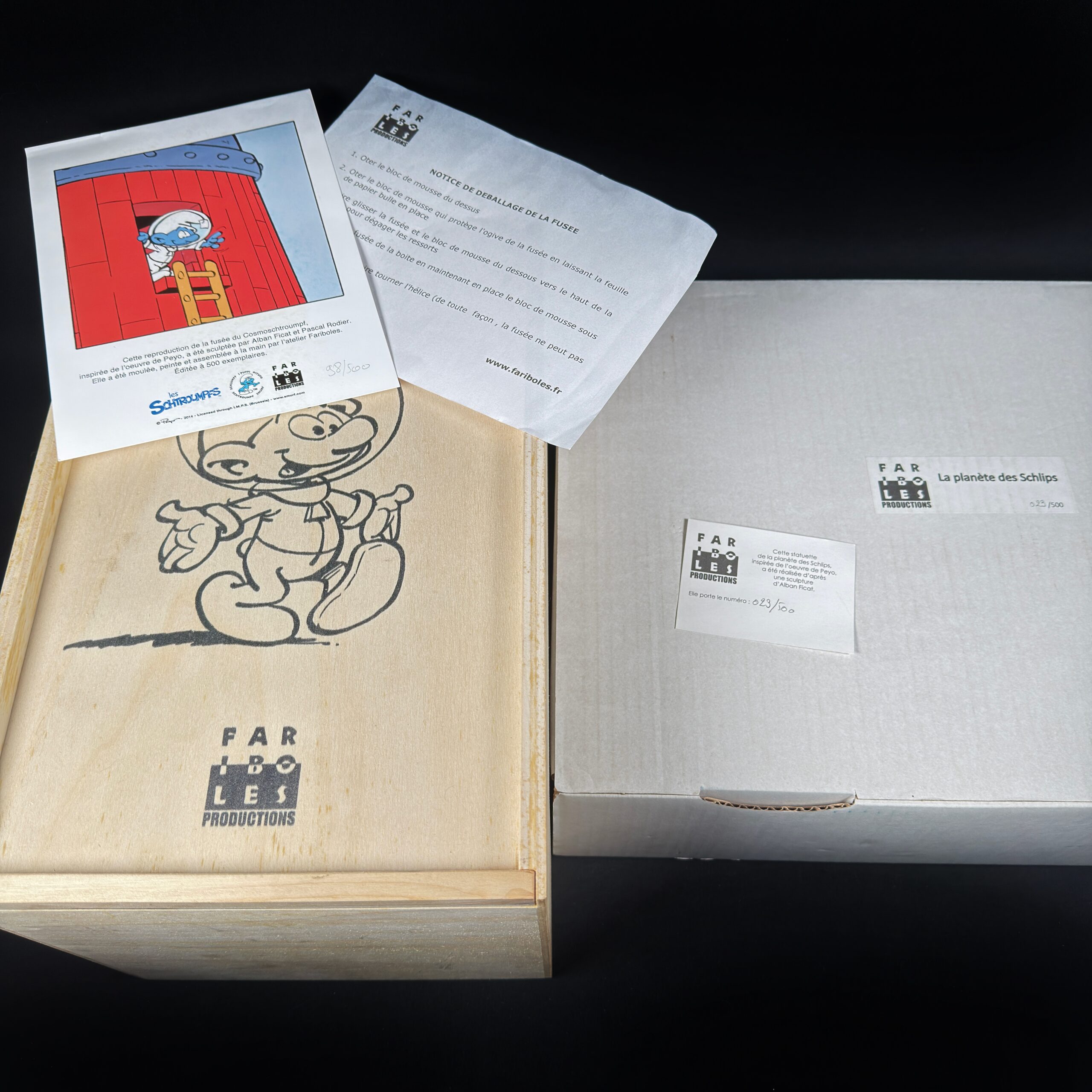 La fusée Cosmoschtroumpf et la planète Schlips signées Fariboles Productions en très bon état pour l’ensemble.