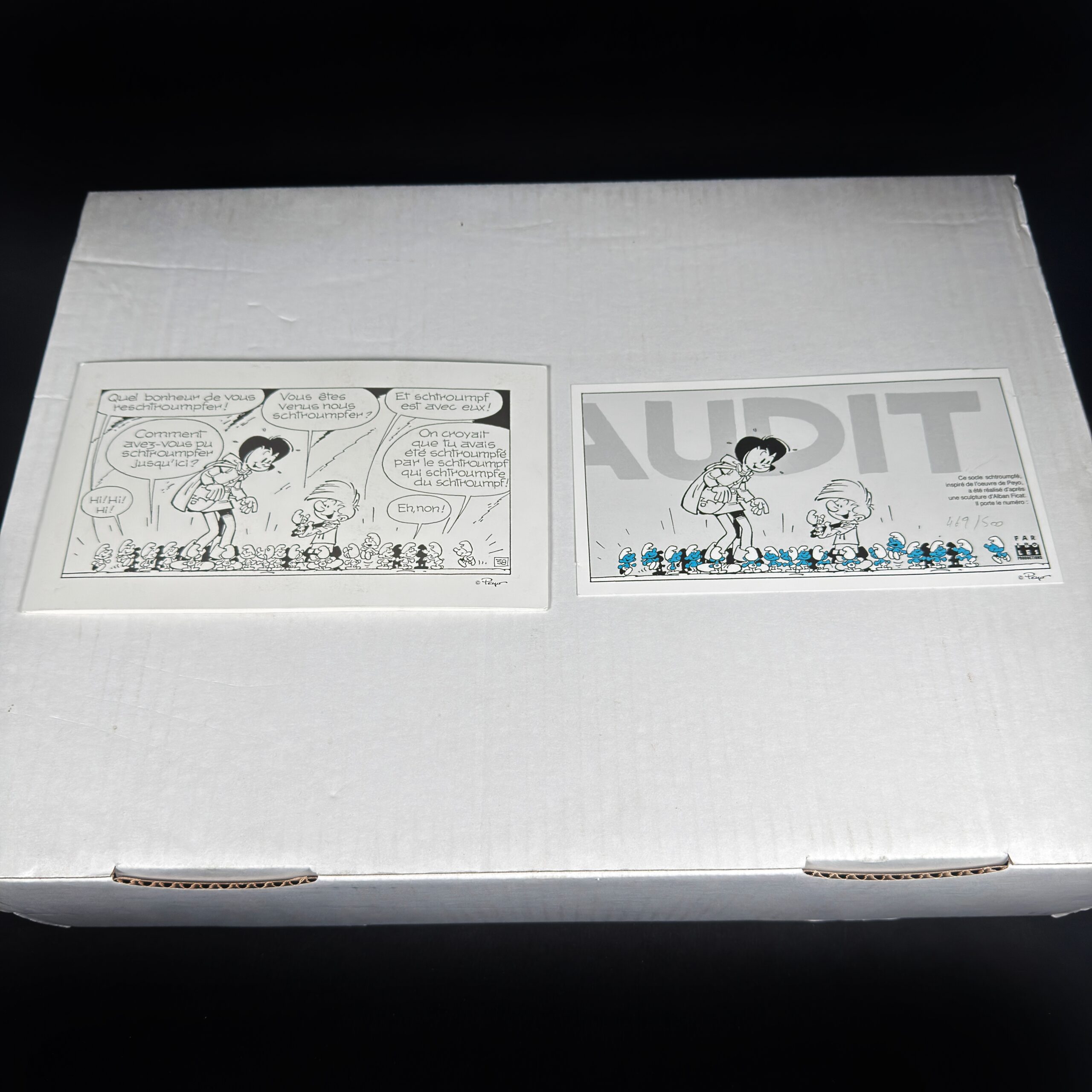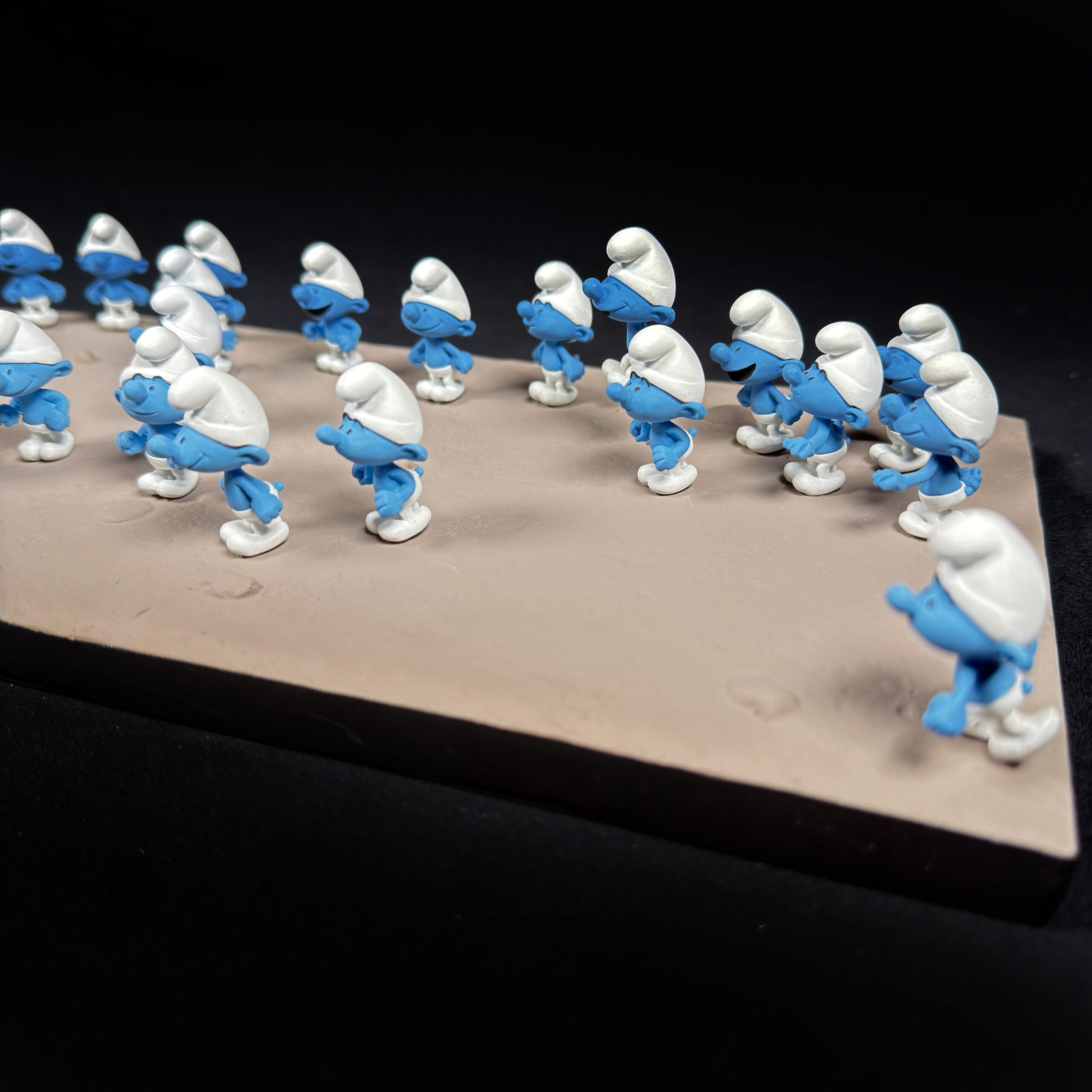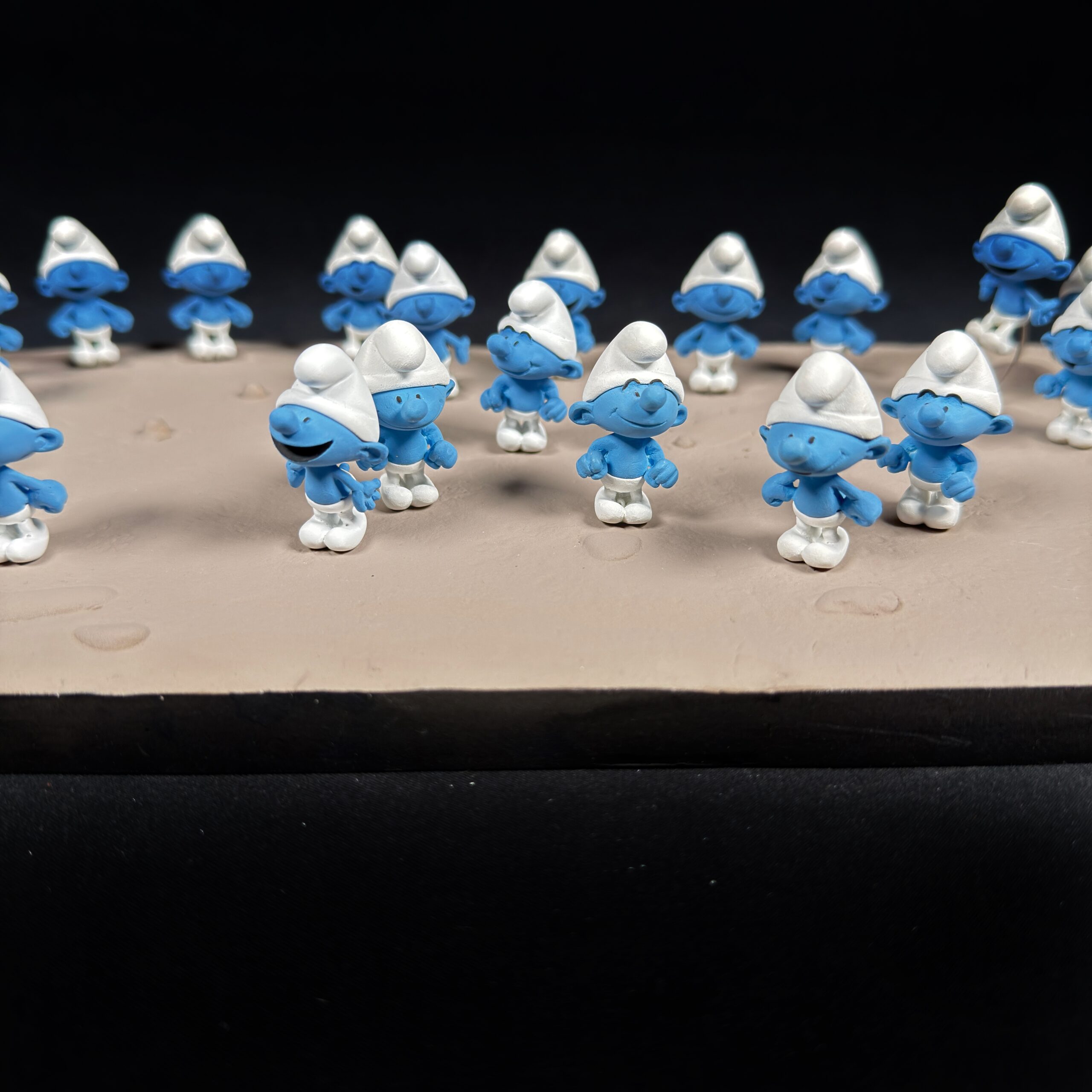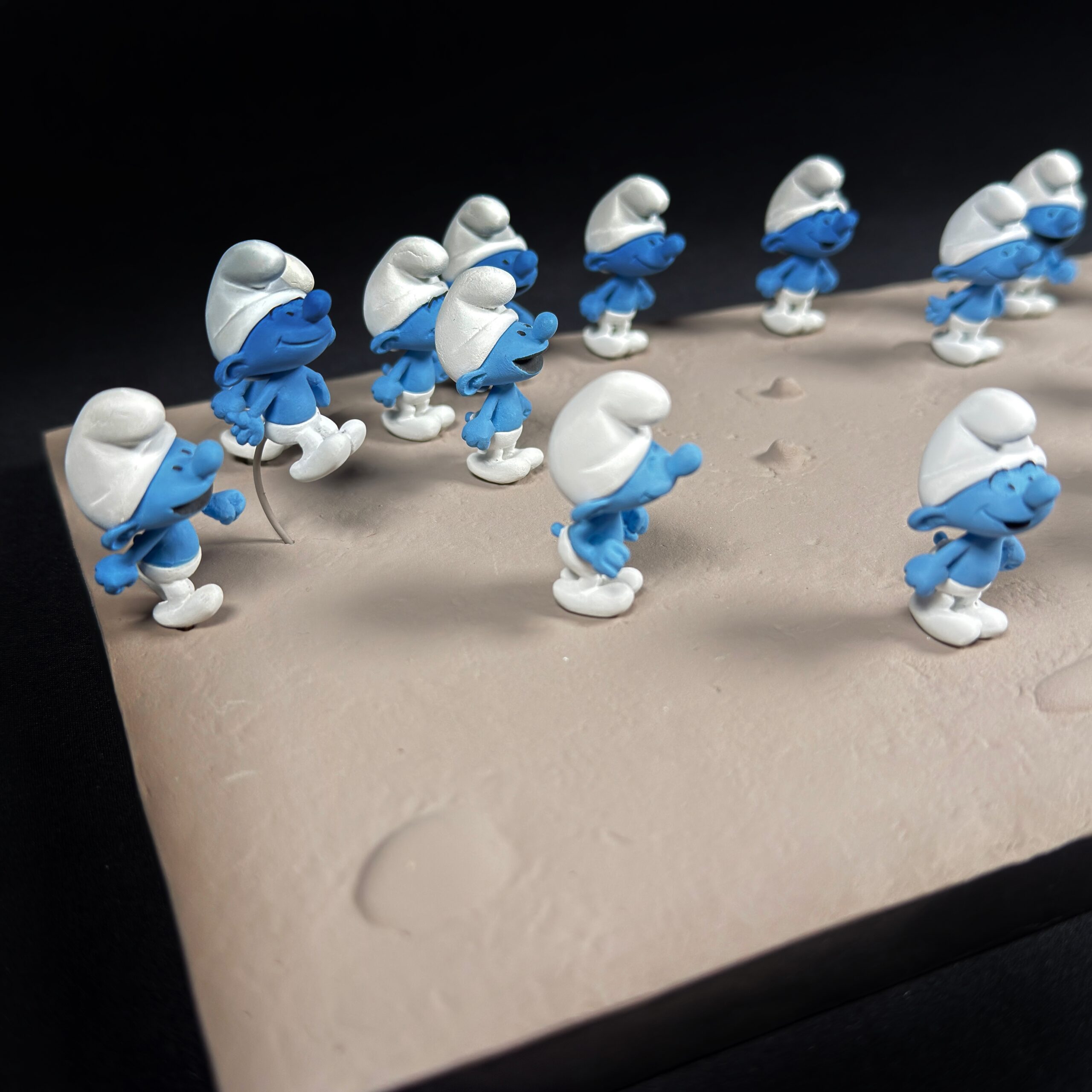 La scène au complet est Schtroumpfante ! Alban, contrairement à ce que vous pourriez penser n’a nullement cloné les Schtroumpfs : il les a sculptés ! Et même si ce labeur peut sembler Schtroumpfant, il a quand même eu beaucoup de plaisir à reconstituer en trois Schtroumpfs cet épisode fondateur de la saga du petit peuple des bonshommes bleus au Schtroumpf blanc.
