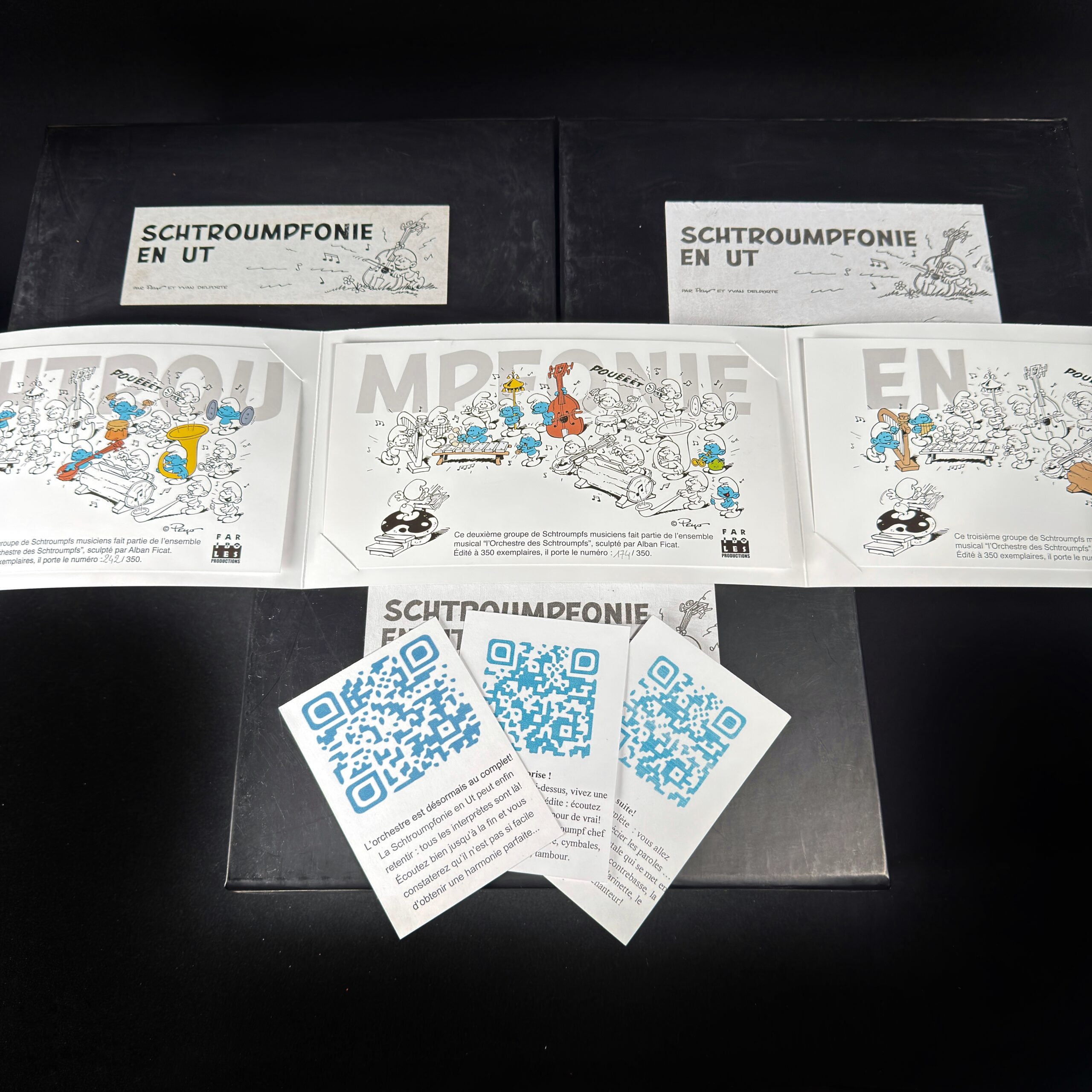 Ensemble de 18 figurines tirées de l’album « Shtroumpfonie en UT », en résine polychrome sculptées par Alban Ficat et réalisées à la main par les ateliers Fariboles Productions.