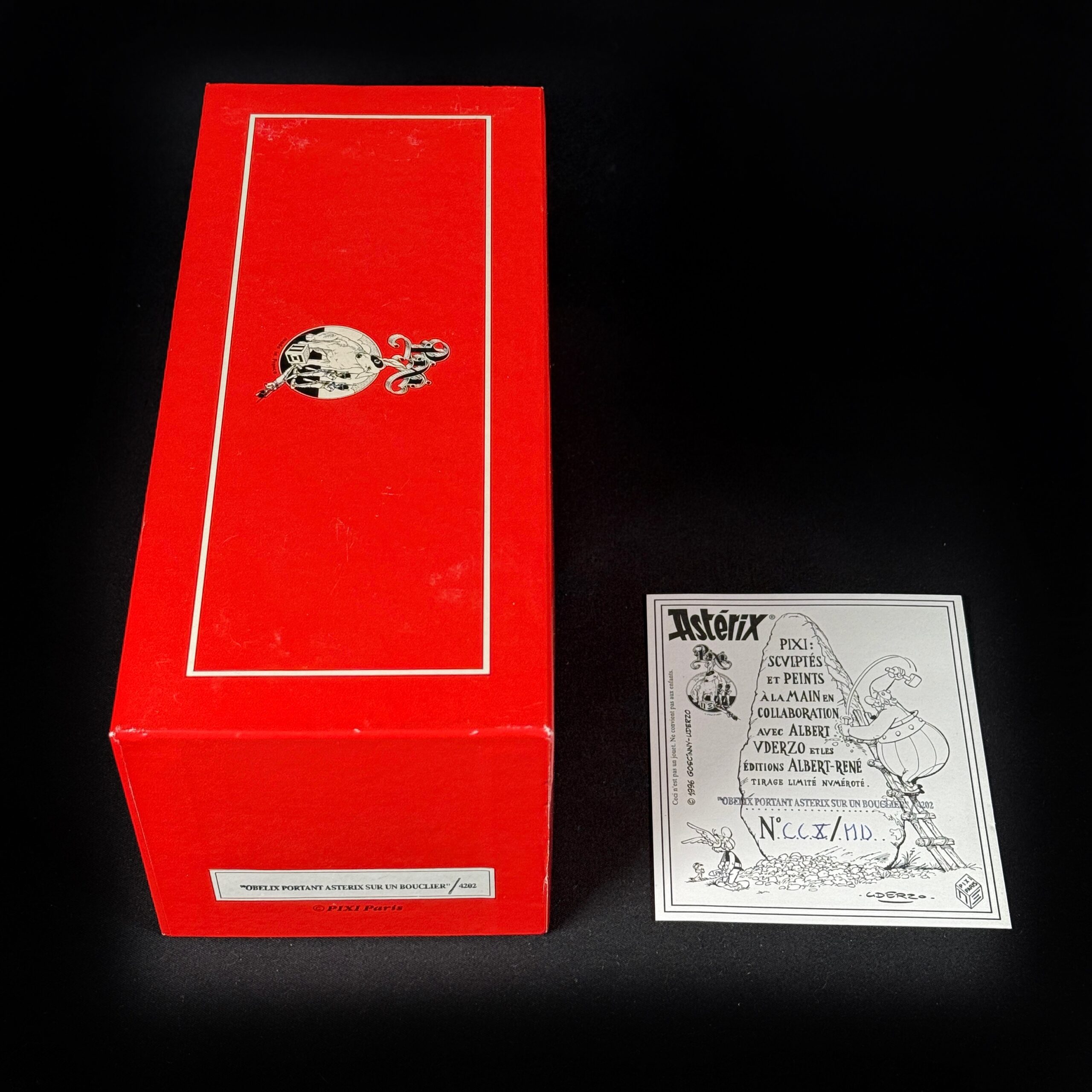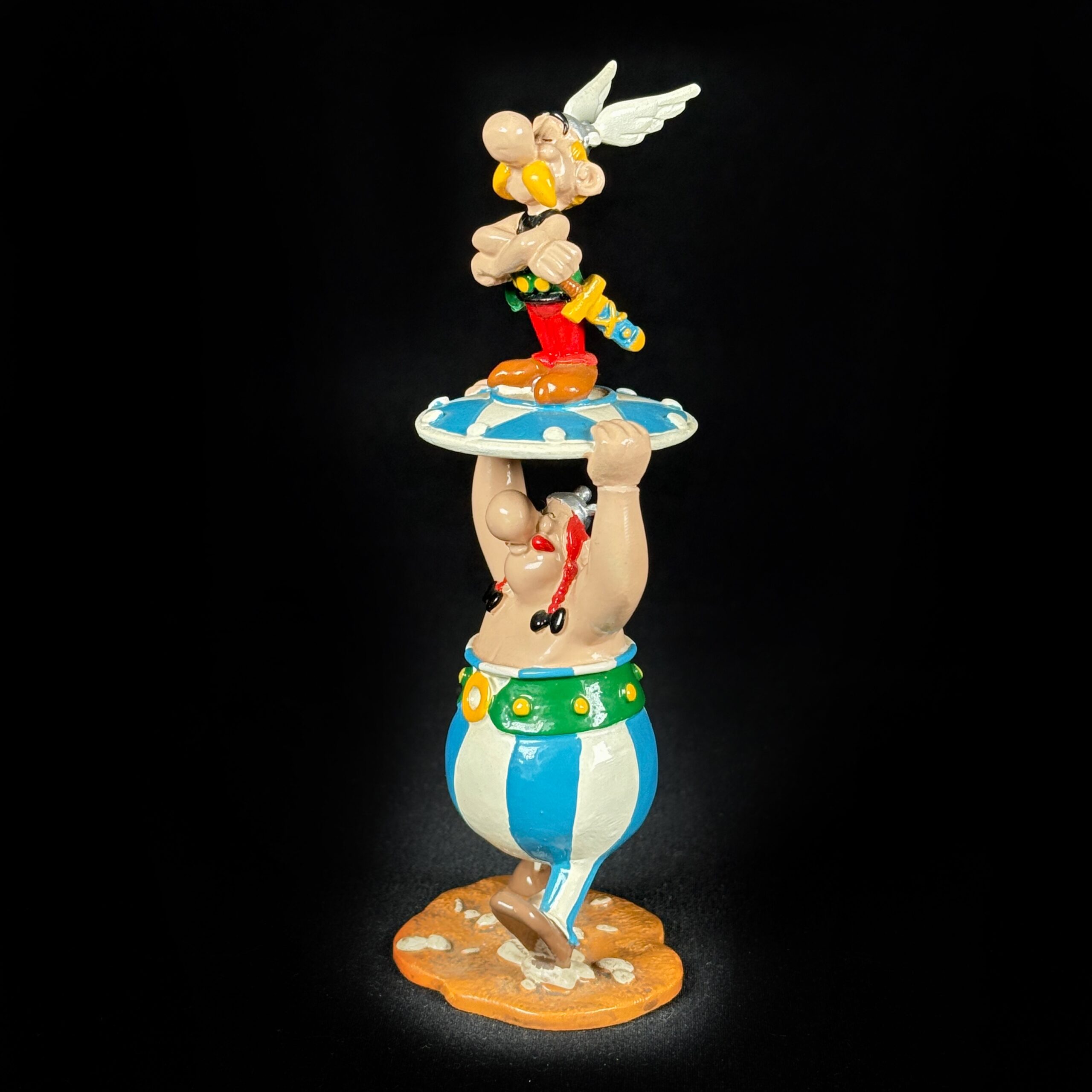Obélix portant Astérix sur un bouclier pixi, en excellent état.