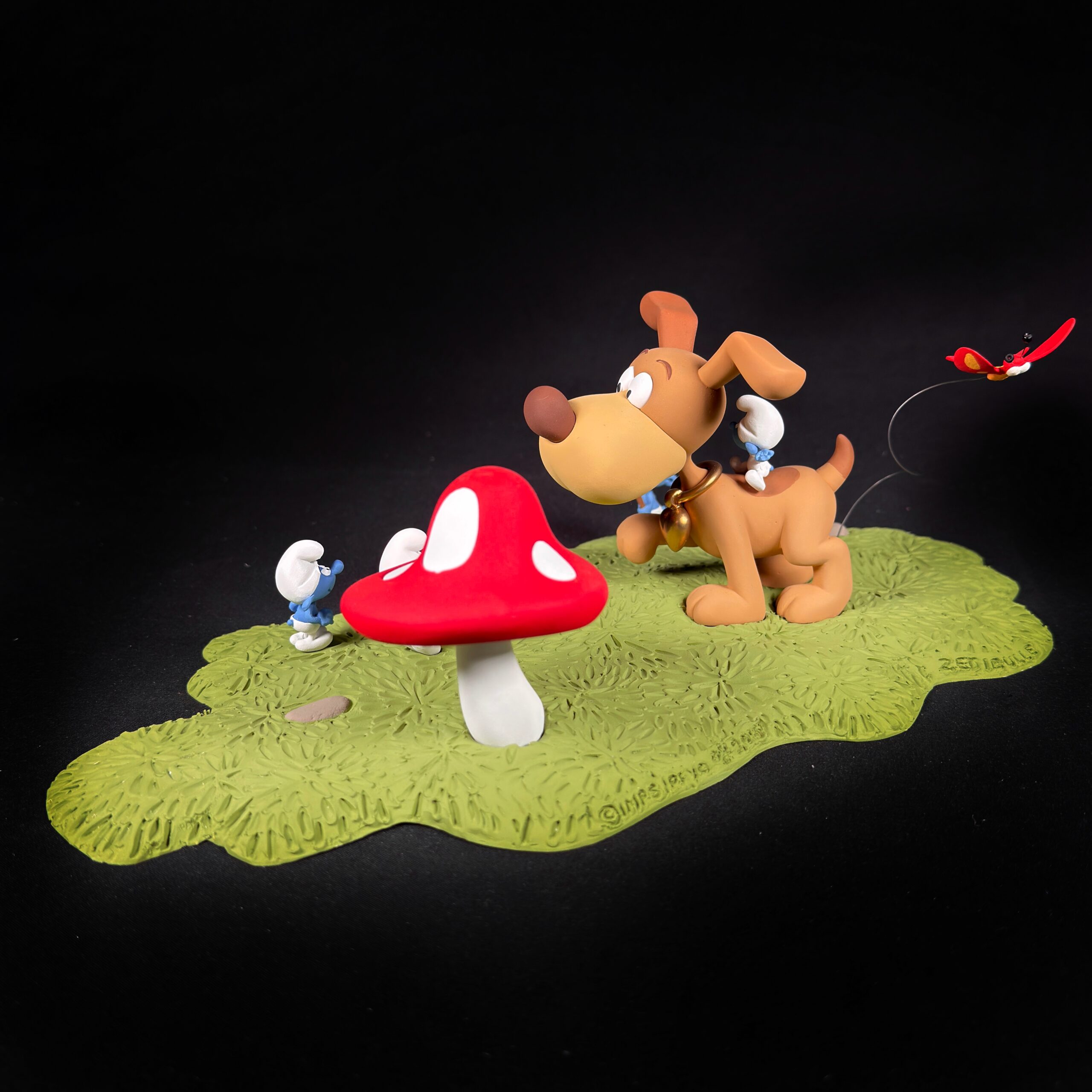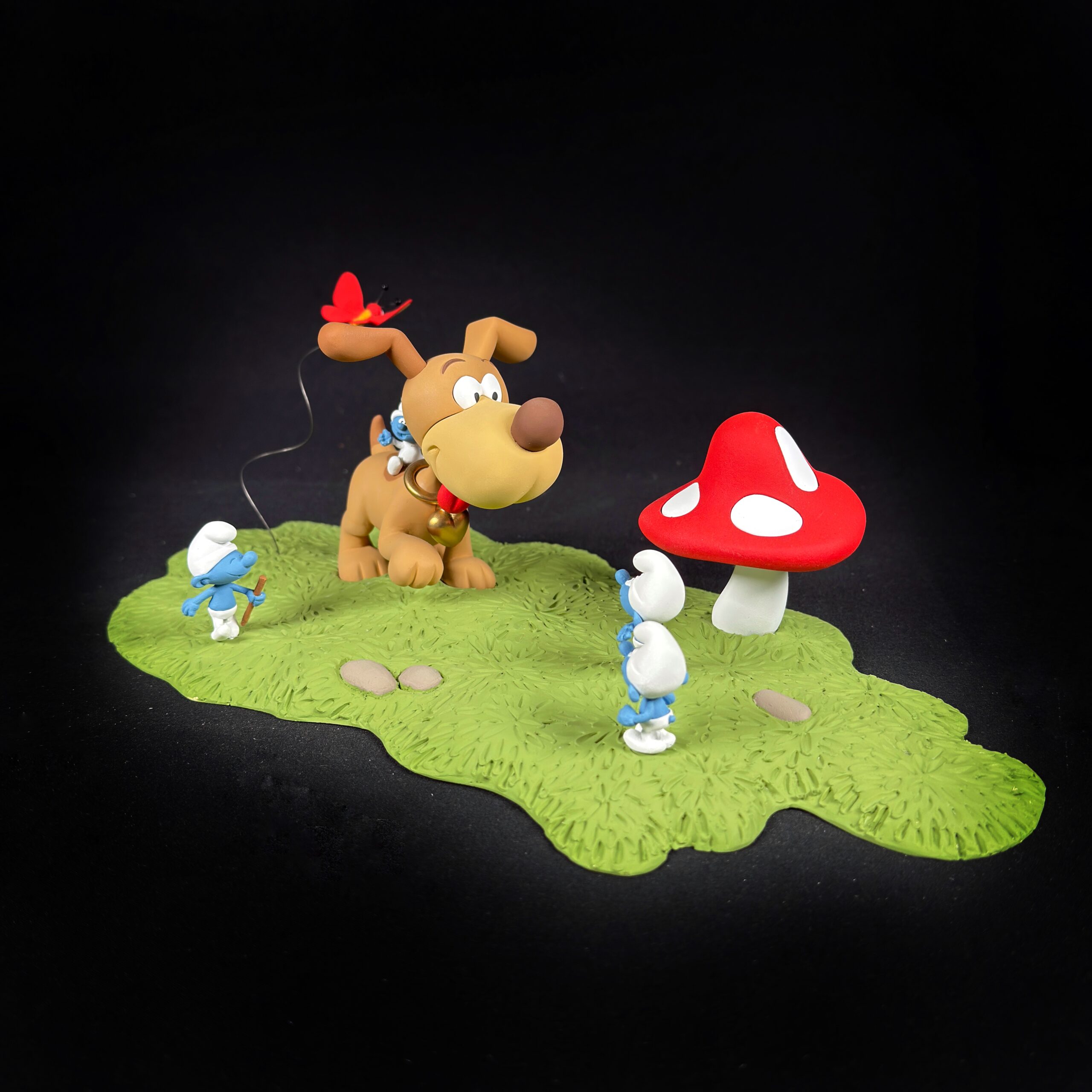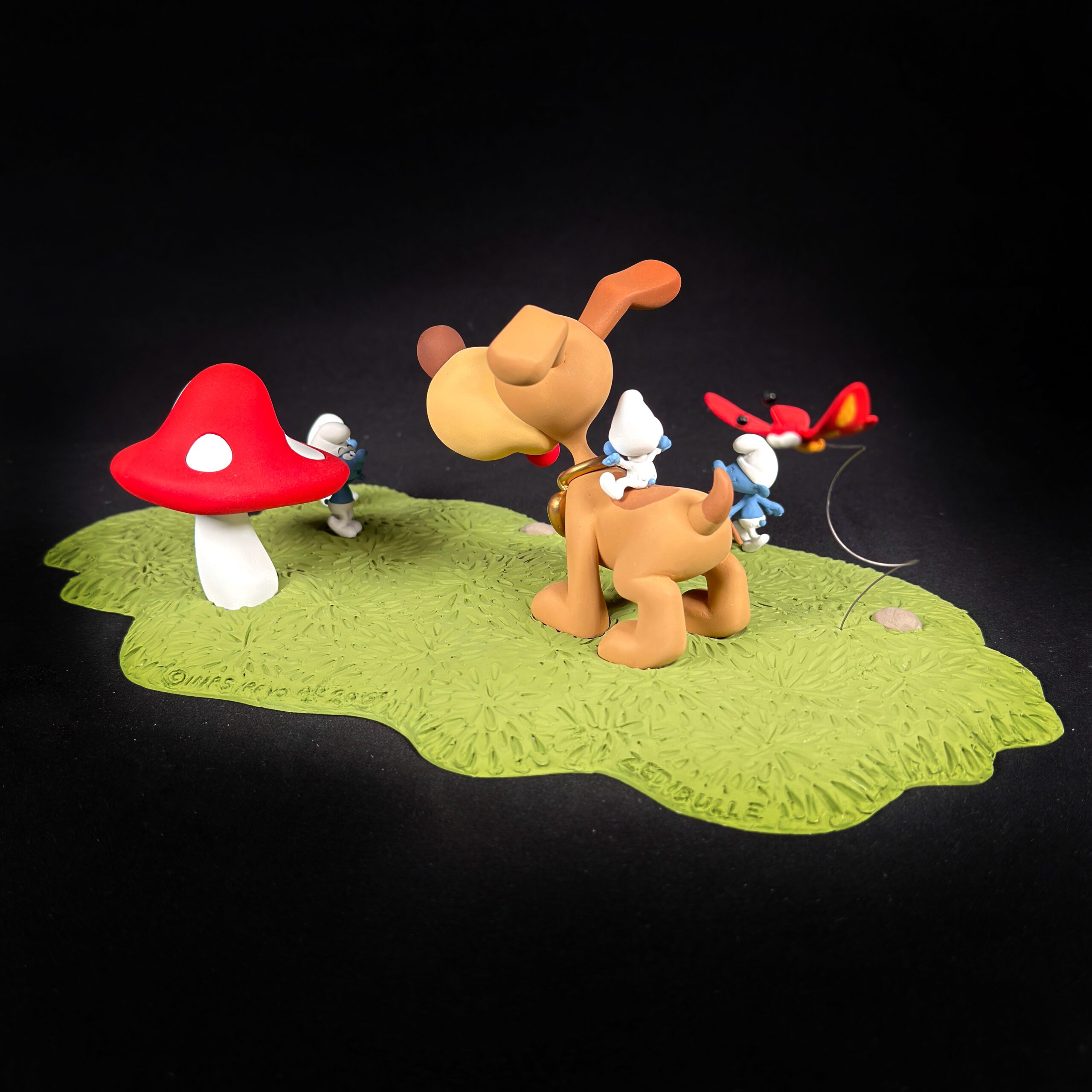 Fariboles : « Tony, de chez Zédibulle, a le chic pour trouver les scènes qui nous font retrouver avec plaisir le petit monde de Peyo ! Cette fois, la petite troupe des schtroumpfs accompagne gaiement la promenade du bébé à dos de Puppy ! Tous les enfants qui ont eu la joie d’avoir un chien pour compagnon sont un jour monté à califourchon sur son dos.